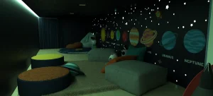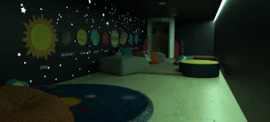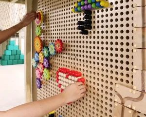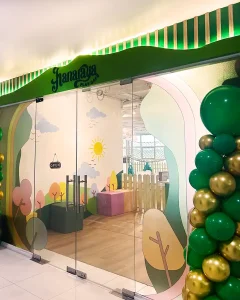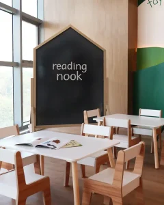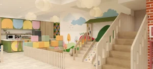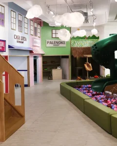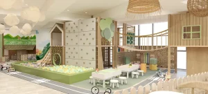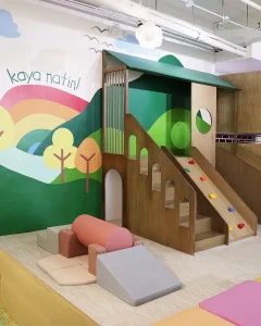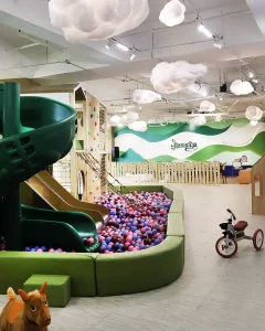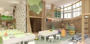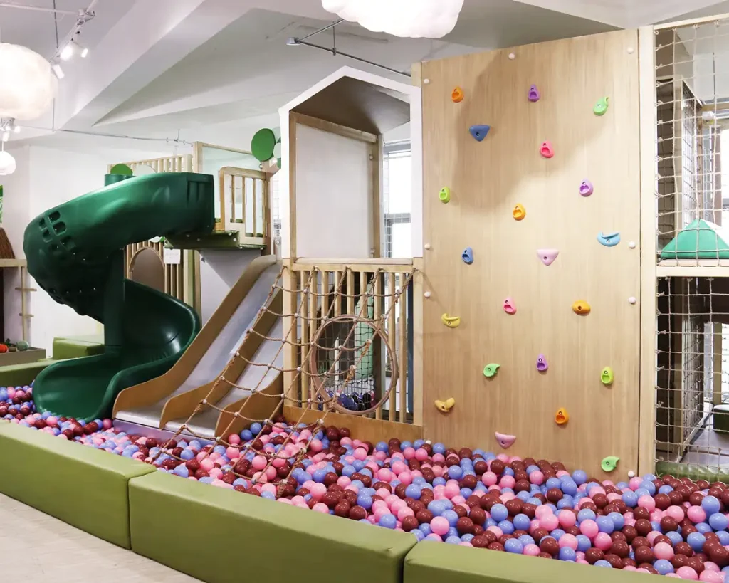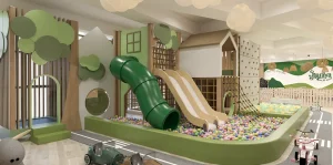 At the core, a sculptural play zone anchors the space, combining slides, ball pits, climbing walls, and tactile elements that support active exploration. Complementing this is a quieter reading nook, defined by warm wood tones and natural light, offering a calm retreat within the environment. Throughout, rounded forms, padded surfaces, and integrated activity panels ensure safety, comfort, and engagement. The result is a well-balanced play cafe—refined in execution, cohesive in design, and thoughtfully crafted to support both interaction and everyday family experience.