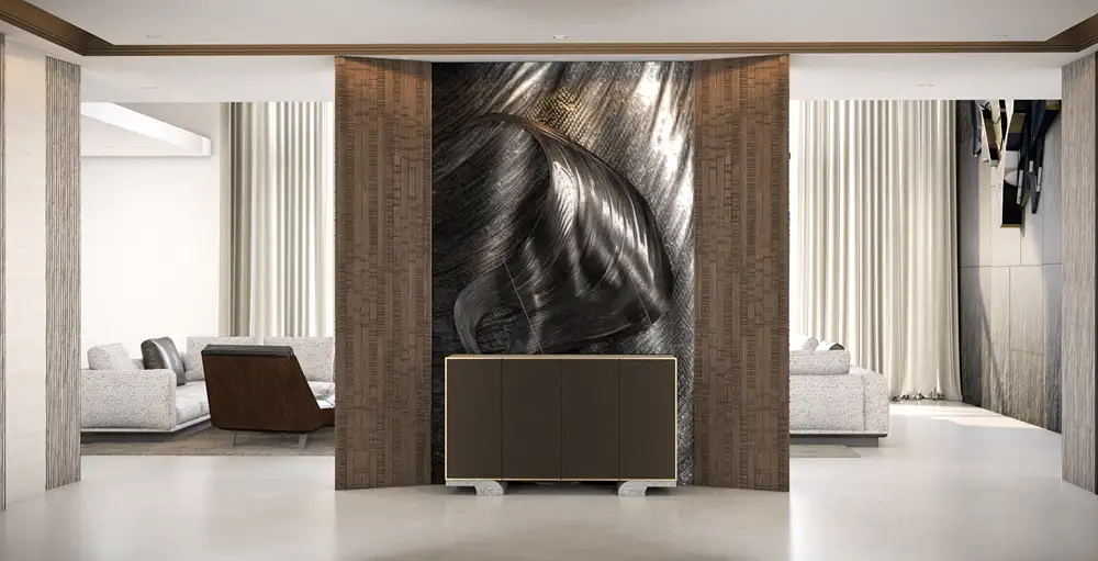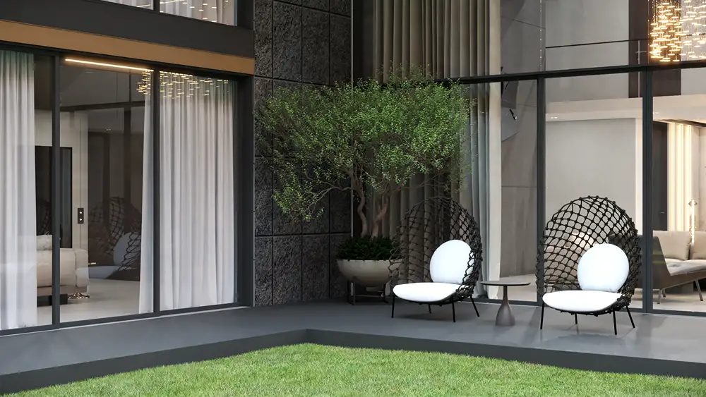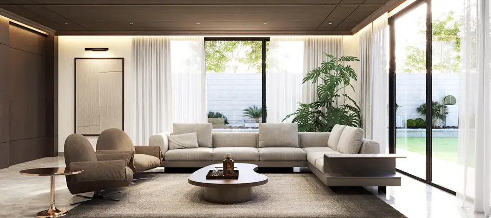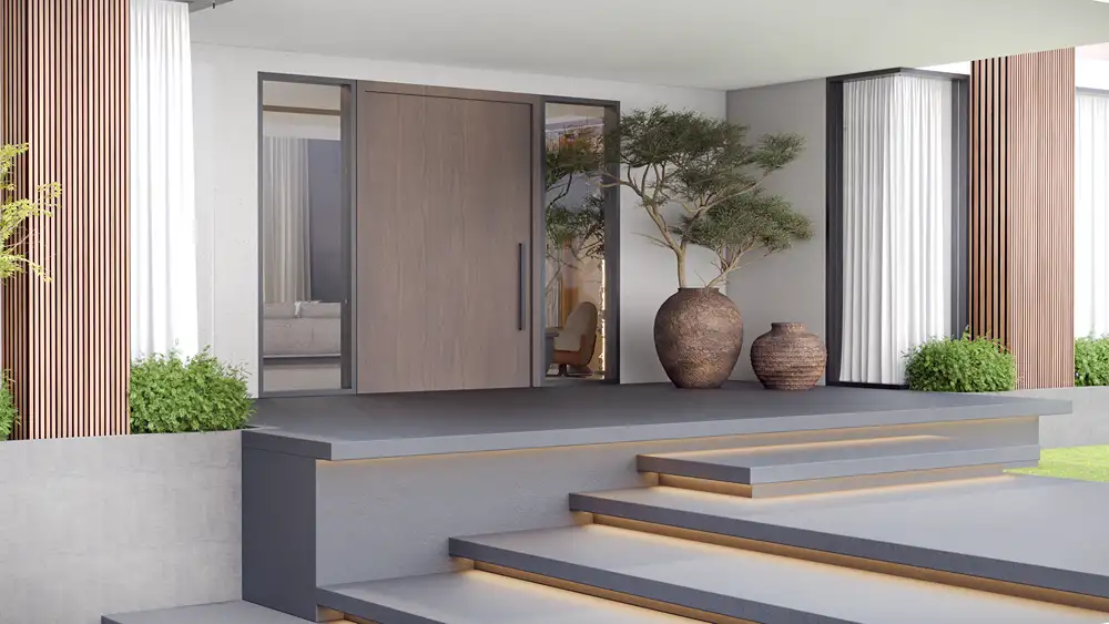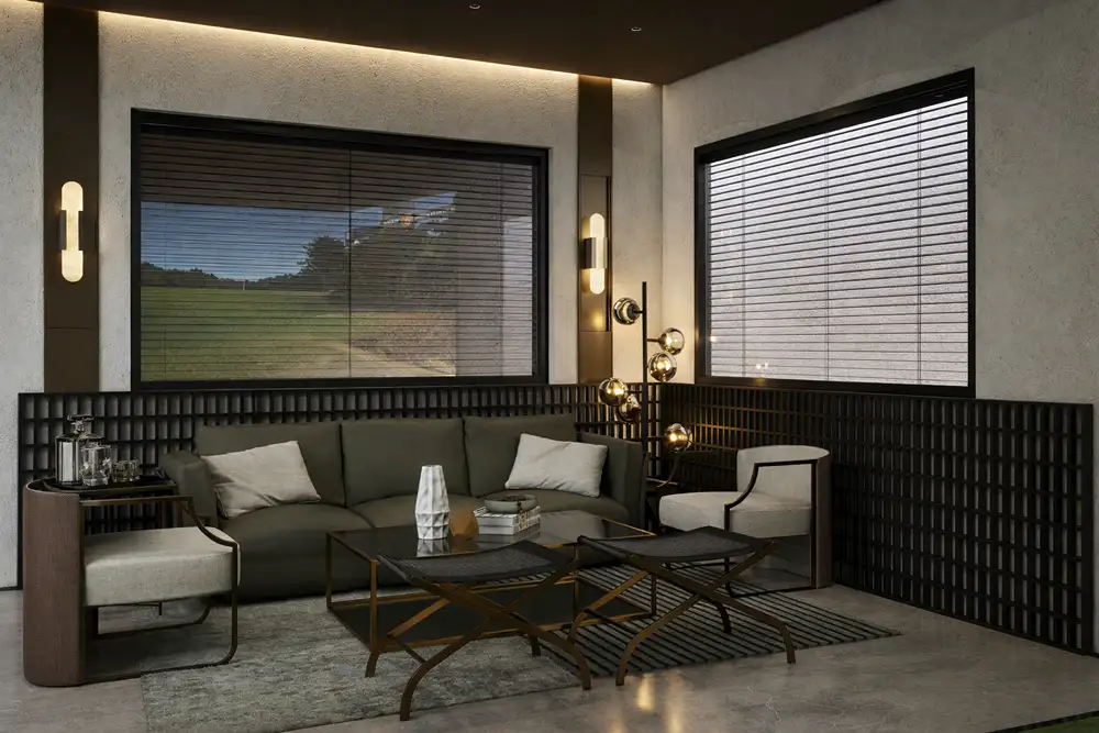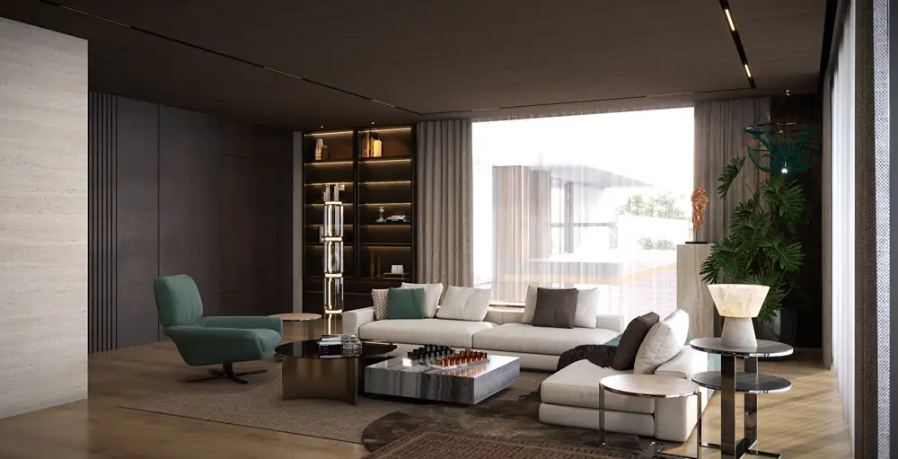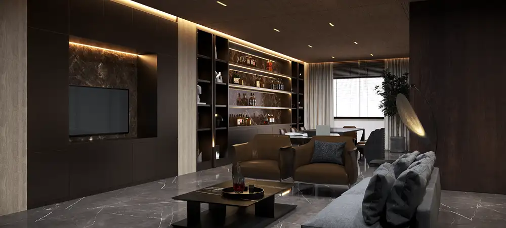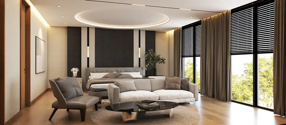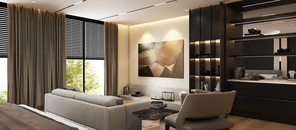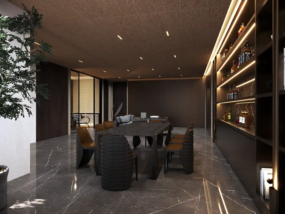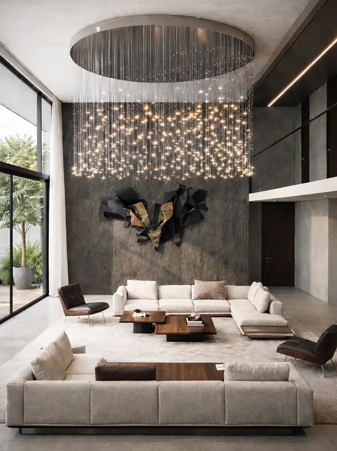 Set within Forbes Park, Makati, this luxury modern contemporary residence is defined by clarity, restraint, and refined spatial planning. Clean architectural lines, a premium material palette of natural stone, wood, and bespoke finishes, and layered ambient lighting create a high-end interior that feels composed and timeless. A double-height living area serves as the focal point—framed by full-height glass windows and a statement chandelier—enhancing natural light, spatial openness, and seamless indoor-outdoor living, a key feature in luxury home design in the Philippines.