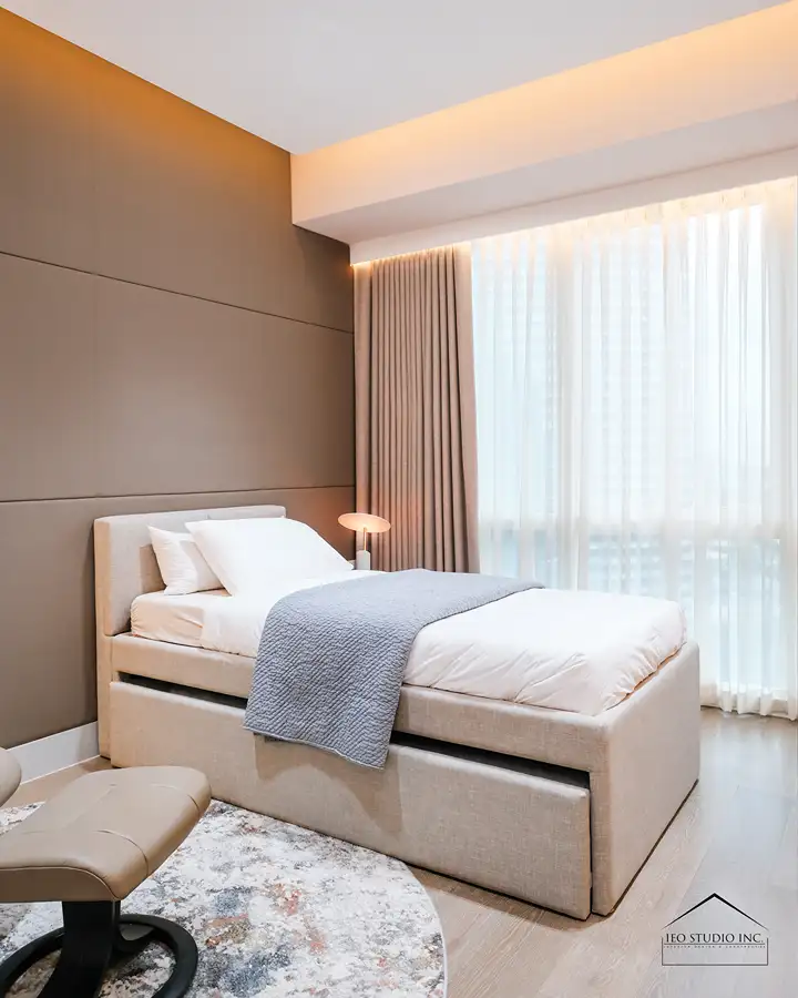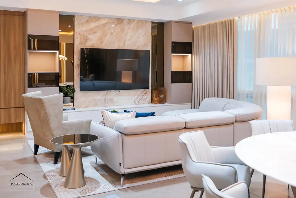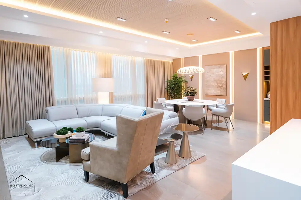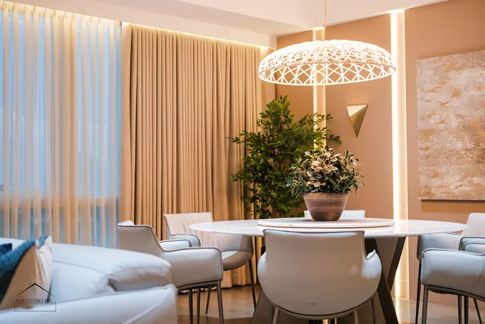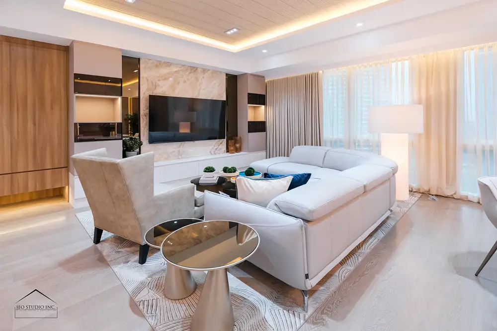True luxury is defined by discipline—where every element is purposeful, and nothing is without intent. The renovation of this 12A Balmori Suites residence by IEO Studio Inc. was conceived in response to the client’s aspiration for a home that embodies quiet sophistication and refined comfort within an urban setting. The design centers on creating a calm and harmonious environment where elegance is expressed through thoughtful restraint, balanced proportions, and carefully selected materials. A palette of soft neutrals, warm wood tones, and subtle metallic accents establishes a timeless foundation, while layered lighting and full-height drapery allow natural light to diffuse gracefully throughout the space, enhancing its serene atmosphere.