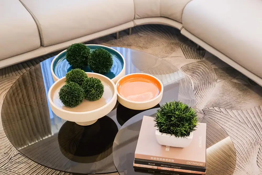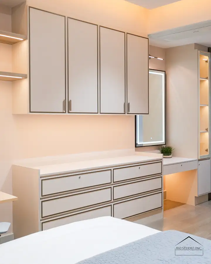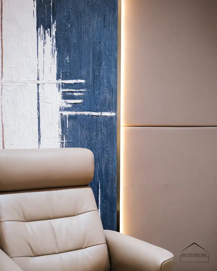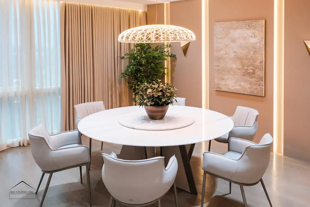 Throughout the residence, IEO Studio Inc. curated a refined composition of sculptural furnishings, tactile textures, and bespoke millwork to bring depth and cohesion to the interiors. The living and dining areas are defined by gentle curves, natural stone surfaces, and integrated lighting details that add architectural rhythm and understated luxury. In the private spaces, muted tones and soft textiles create a tranquil retreat, resulting in a cohesive home that reflects timeless elegance and a carefully considered sense of modern living.